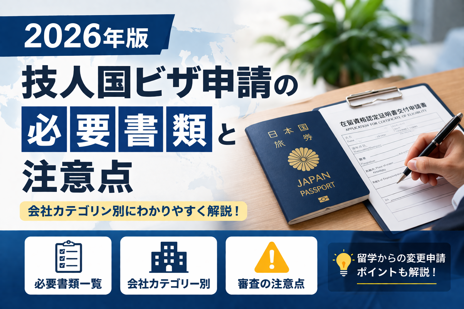技人国ビザは、会社の規模、本人の学歴・職歴、業務内容、採用形態によって必要書類や説明のポイントが変わります。