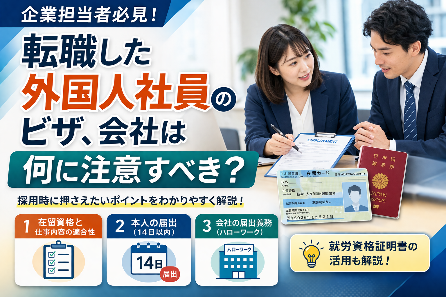 この記事では、転職した外国人社員を採用する会社が注意すべきポイントを、入管実務と労務実務の両面からわかりやすく解説します。