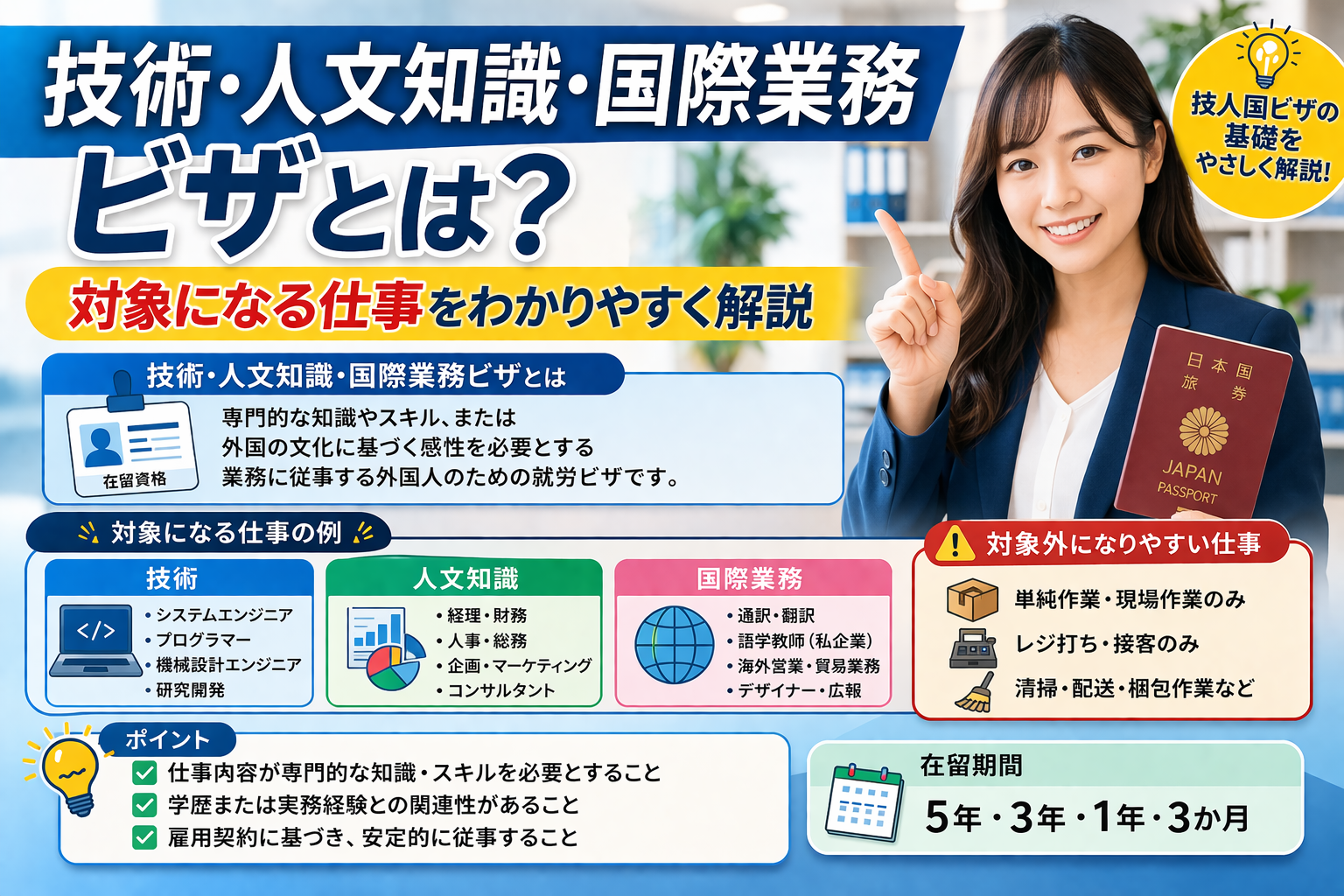 技術・人文知識・国際業務ビザは、専門的な知識や国際性を必要とする仕事のための在留資格です。